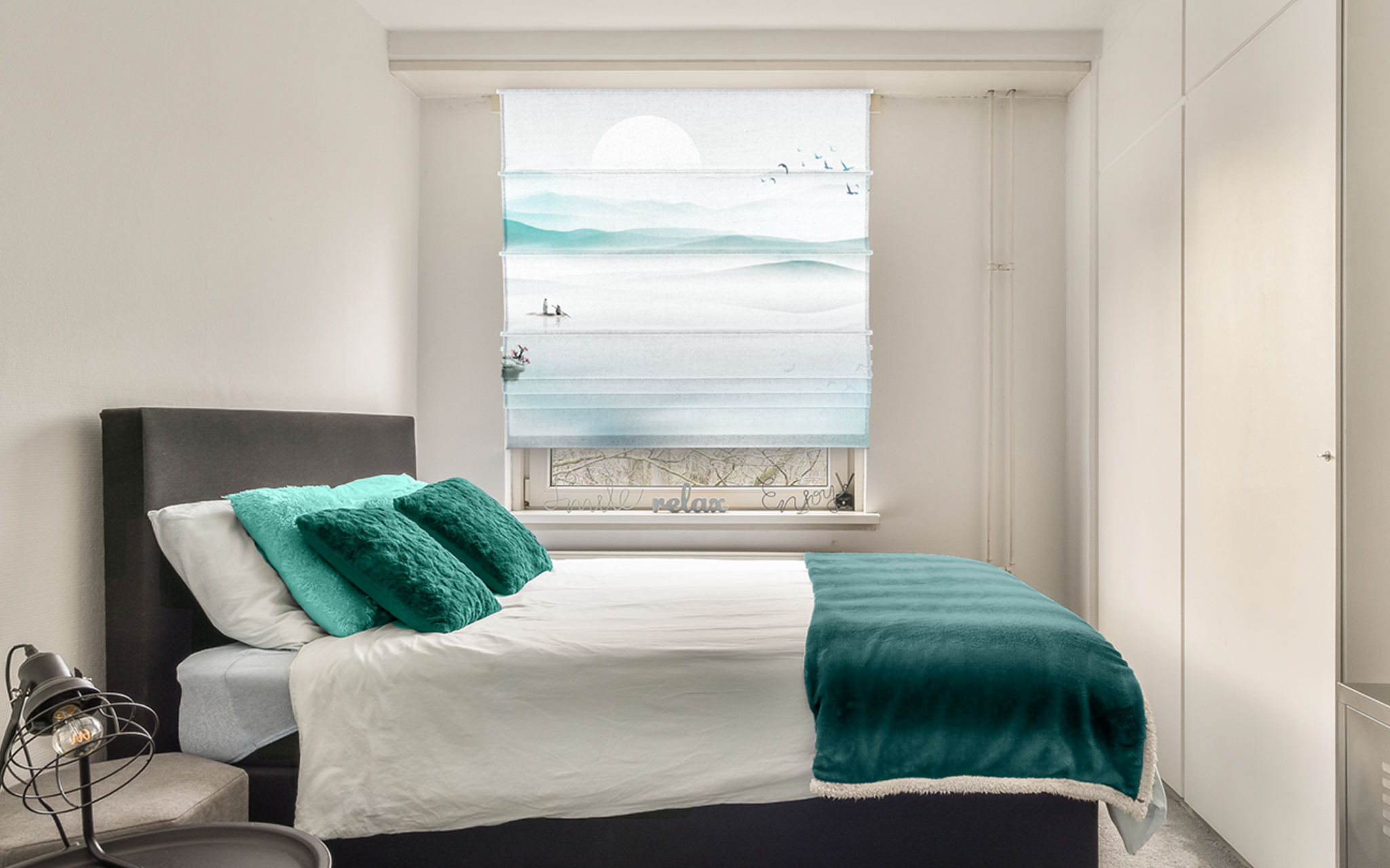 This Blue Artistic Atmosphere Roman Shade offers a stylish, creative addition to any room. The unique design, featuring an artistic blue atmosphere, creates a beautiful centerpiece for any interior. The shade is designed to provide optimal privacy, control, and efficiency for your home.