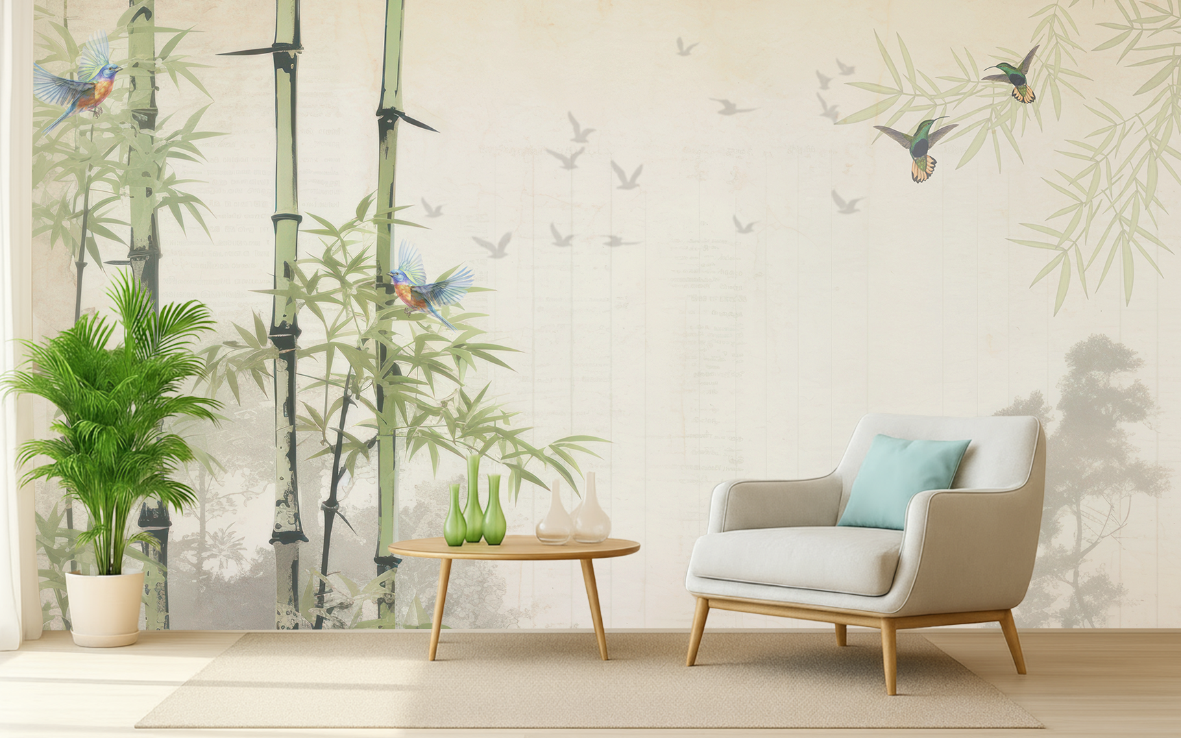 A gentle haze drifts through slender bamboo, evoking quiet stillness and the peaceful rhythm of nature’s breath.