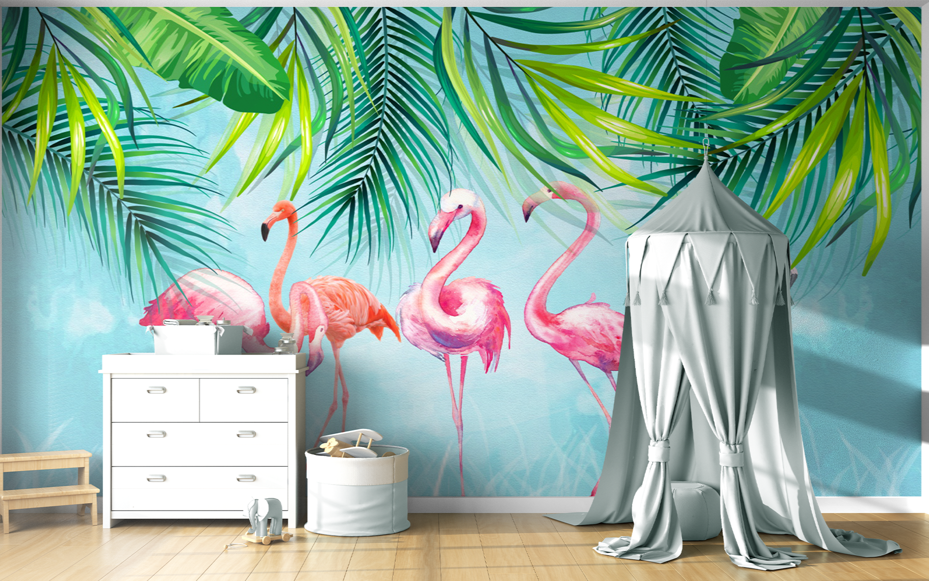 Bring a piece of the tropics into your home with this elegant wall art mural featuring two graceful flamingos in a beautiful setting of lush tropical leaves. The perfect way to add a relaxing, natural element to any room.