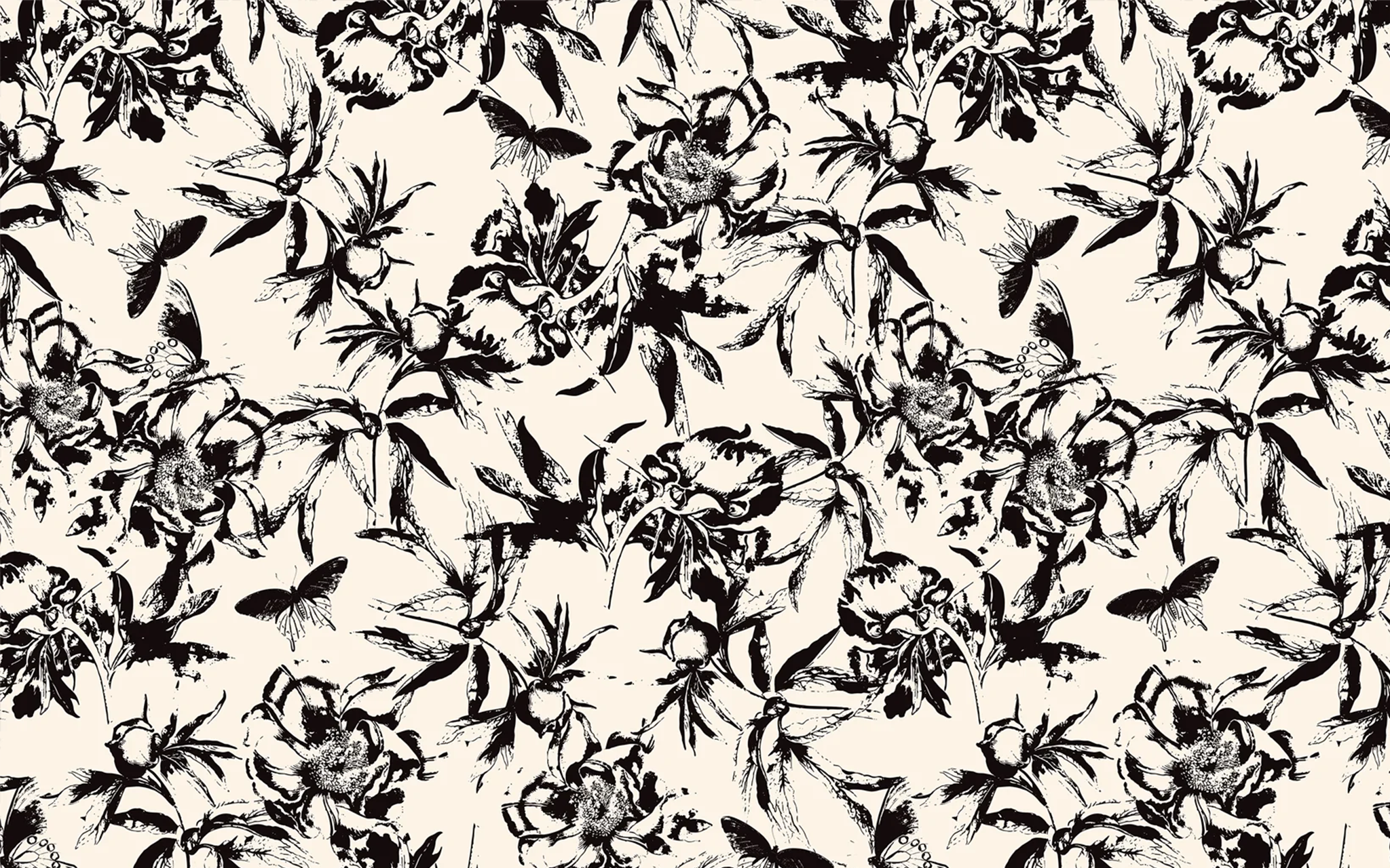 This wallpaper blends bold, stylized floral patterns with a deep black background, creating a striking and modern contrast for a sophisticated, artistic look.