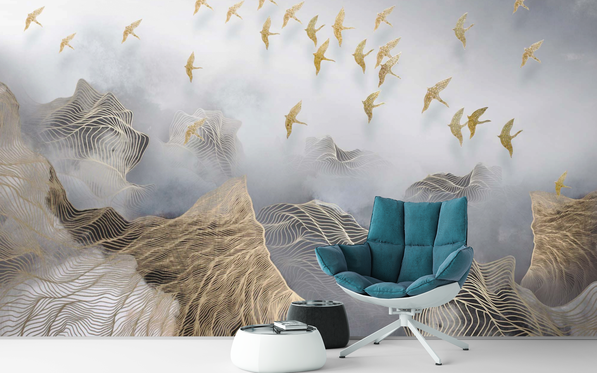 This beautiful Golden Birds Flying Above Foggy Mountain wallpaper is sure to capture the attention of any viewer with its intricate design and brilliant colors. Featuring a majestic mountain range enveloped in fog beneath a sky filled with golden birds, this wallpaper is sure to bring a touch of beauty to any home.