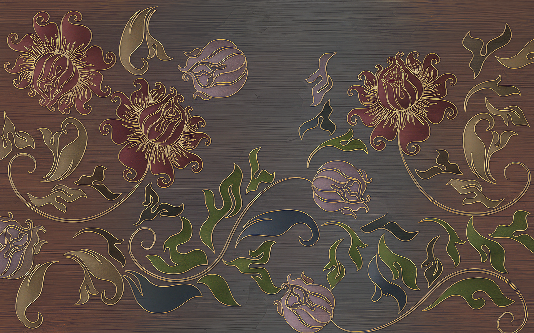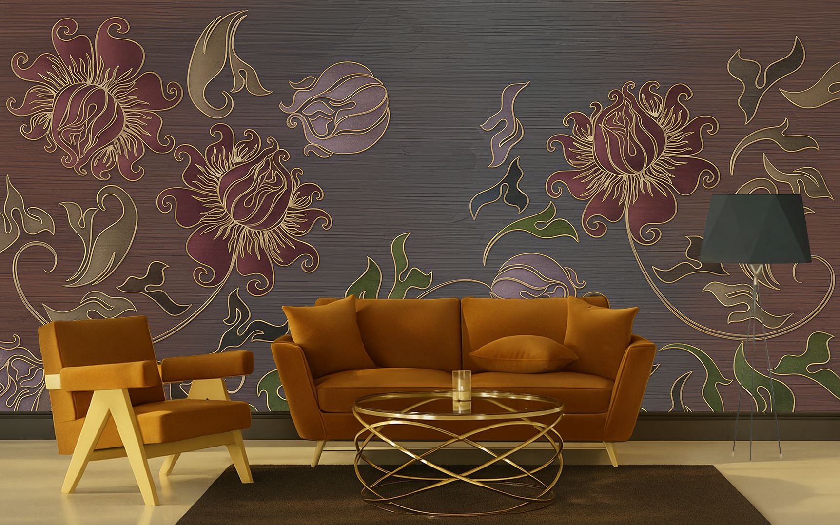 An elegant floral pattern featuring deep crimson petals and golden outlines on a warm, textured background. The mix of gold, green, and plum tones creates a luxurious, vintage charm perfect for statement walls or classic interiors.