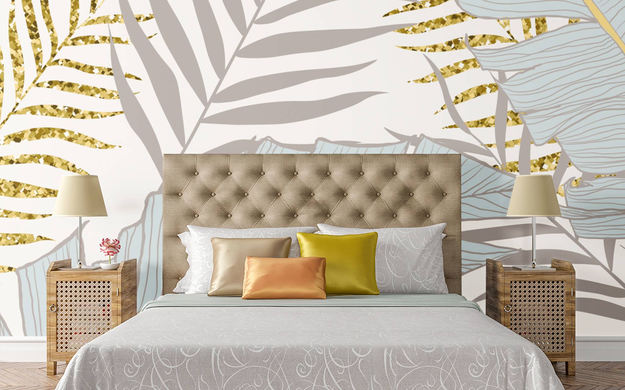 The Light Blue and Golden Leaves wall mural offers a stunning combination of light blue and golden leaves, perfect for creating a dramatic effect in your living room or home office. The colors are vibrant and the design is artistic, making it a great addition to any home décor.