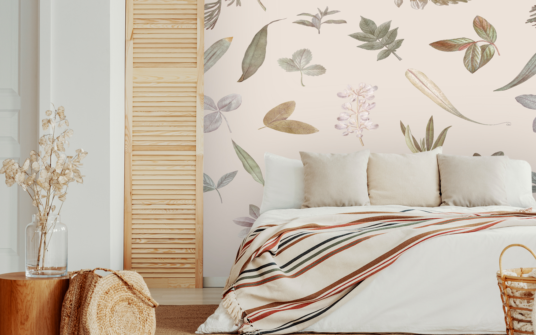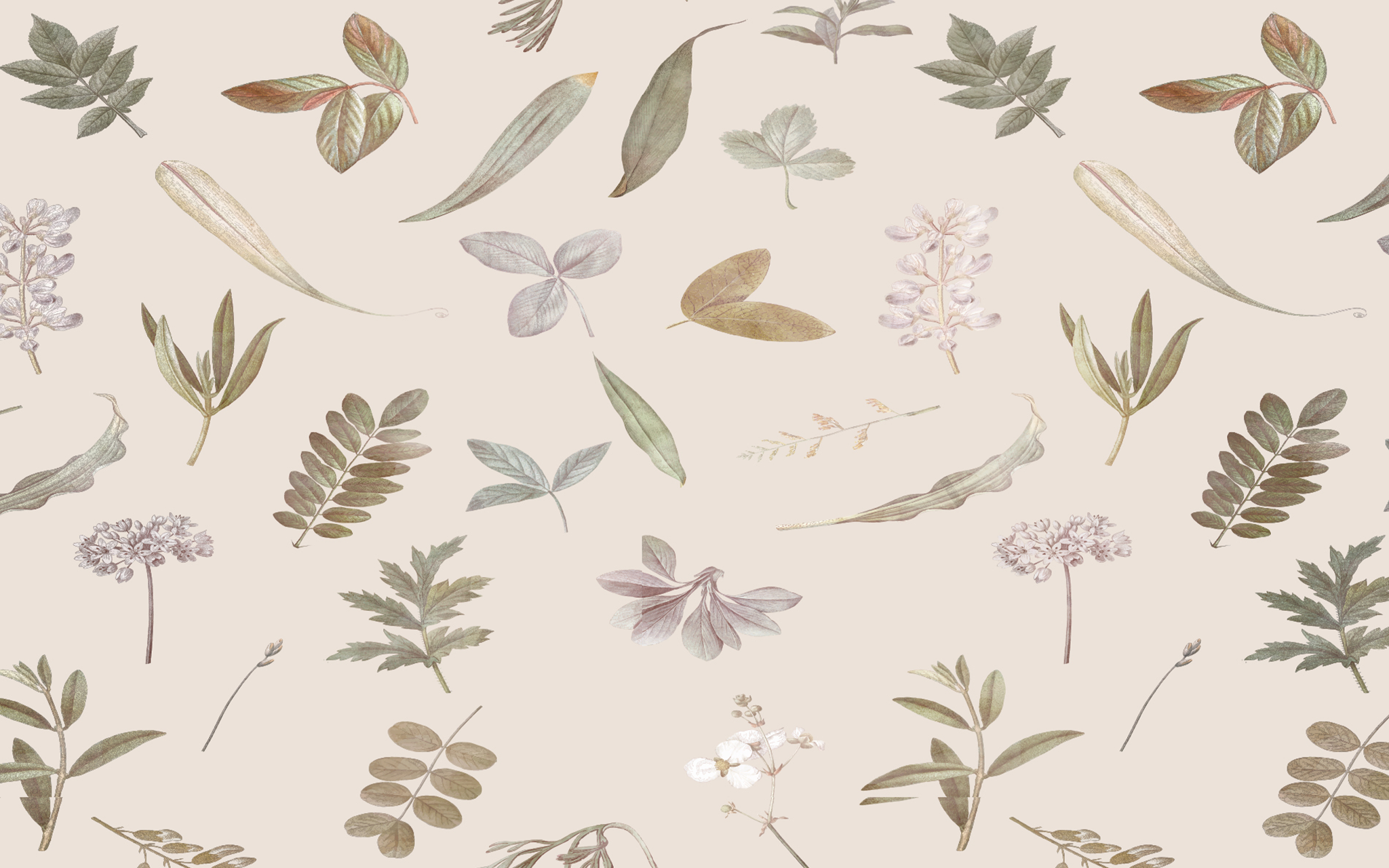 Featuring a lush plants and leaves pattern on a light cream background, this wall art creates a warm and inviting atmosphere in any room. The cream background seamlessly blends into the wall to create a beautiful and subtle effect.
