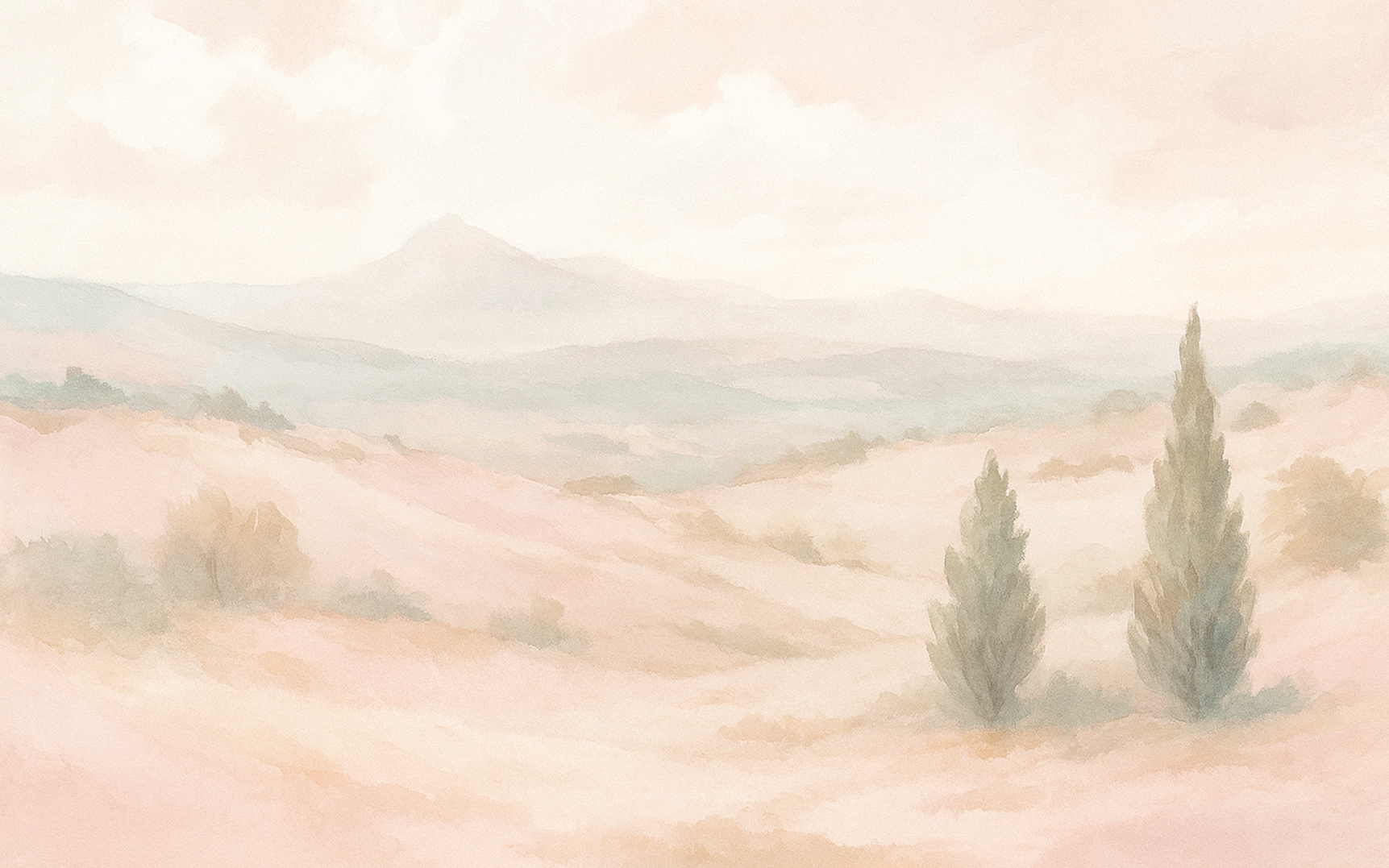 A tranquil landscape bathed in soft ochre tones and gentle mist, evoking the quiet calm of a sunlit valley wrapped in peaceful stillness.