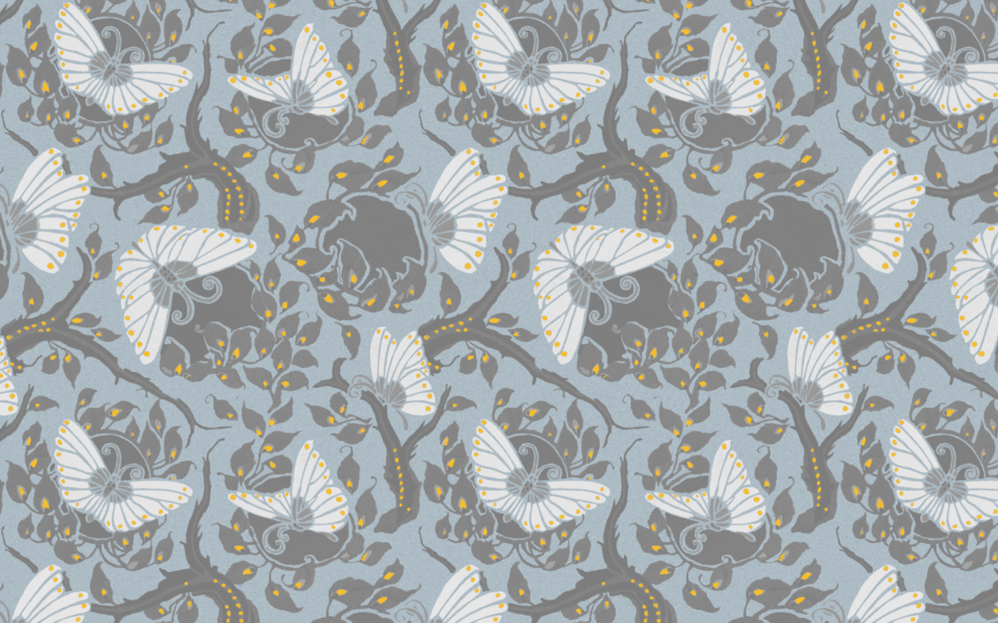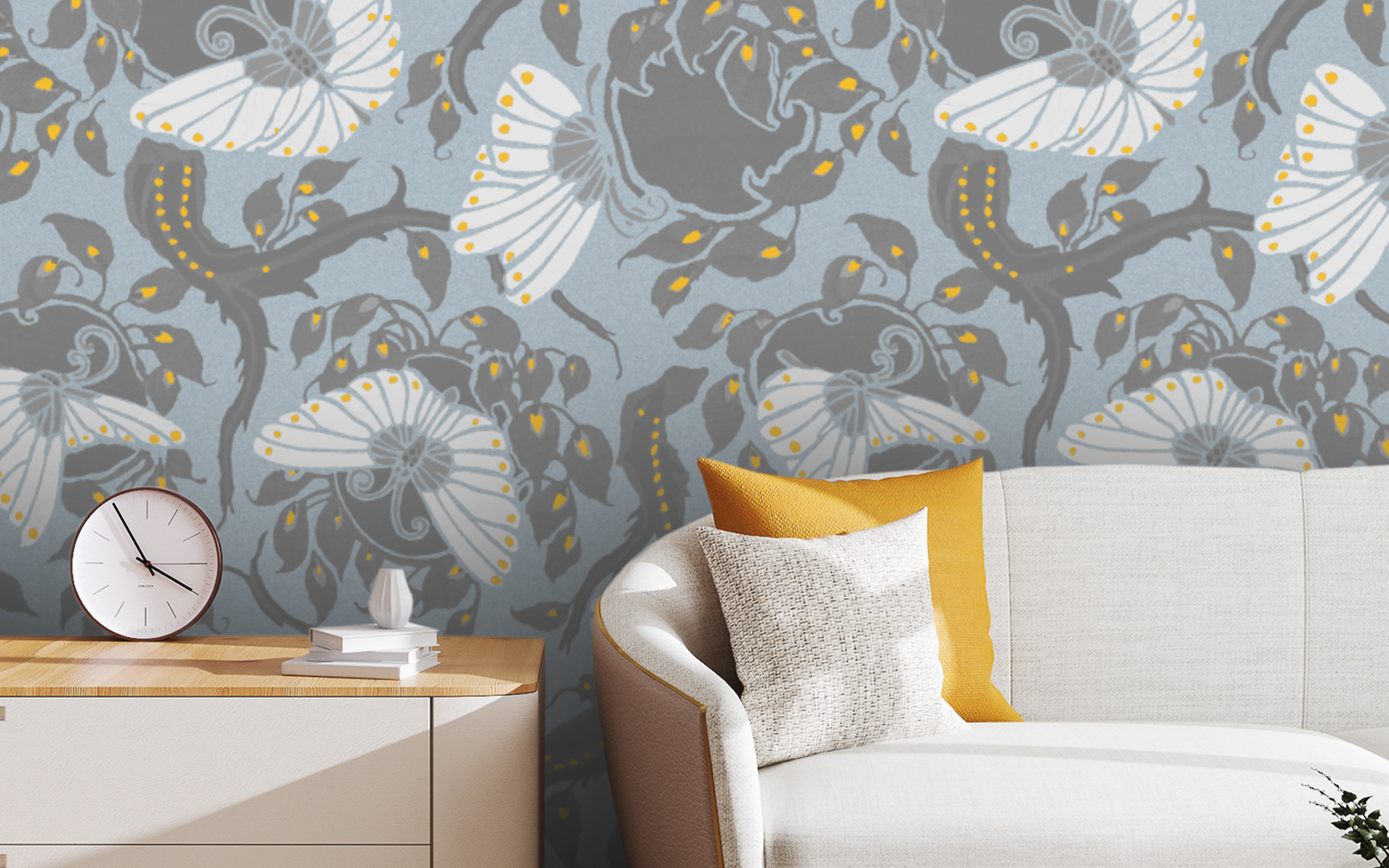 This stunning wall art features a white butterfly pattern on a light blue background, sure to make a statement in any room. With a seamless design, this piece is sure to be a lasting part of your home's decor.